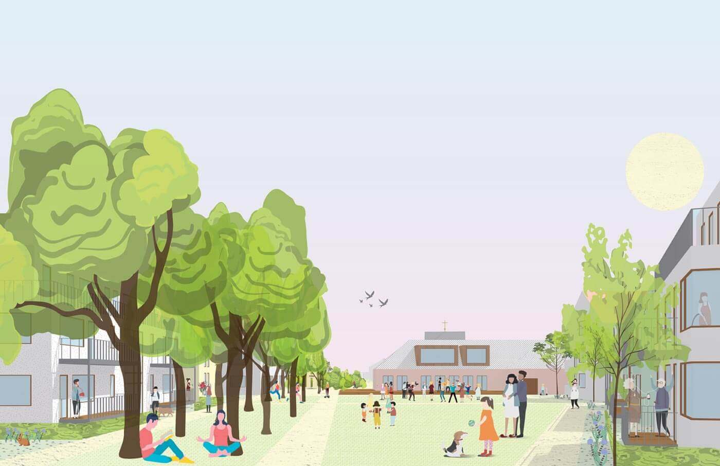 The centrally located old school building is transformed into a new Community Centre which forms the public front to the multigenerational park. This is where the Loop begins and ends, a ring-shaped green corridor that accommodates the existing row of trees, gives space to athletes and flâneurs and links the quarter to the few possible existing paths. The Community Centre and St. Franziskuskirche stand opposite each other along an axis. Together with the multigenerational park, the church square and the square in front of the former School it form a sequence of open spaces, addresses and quality of stay – creating space for a lively quarter.